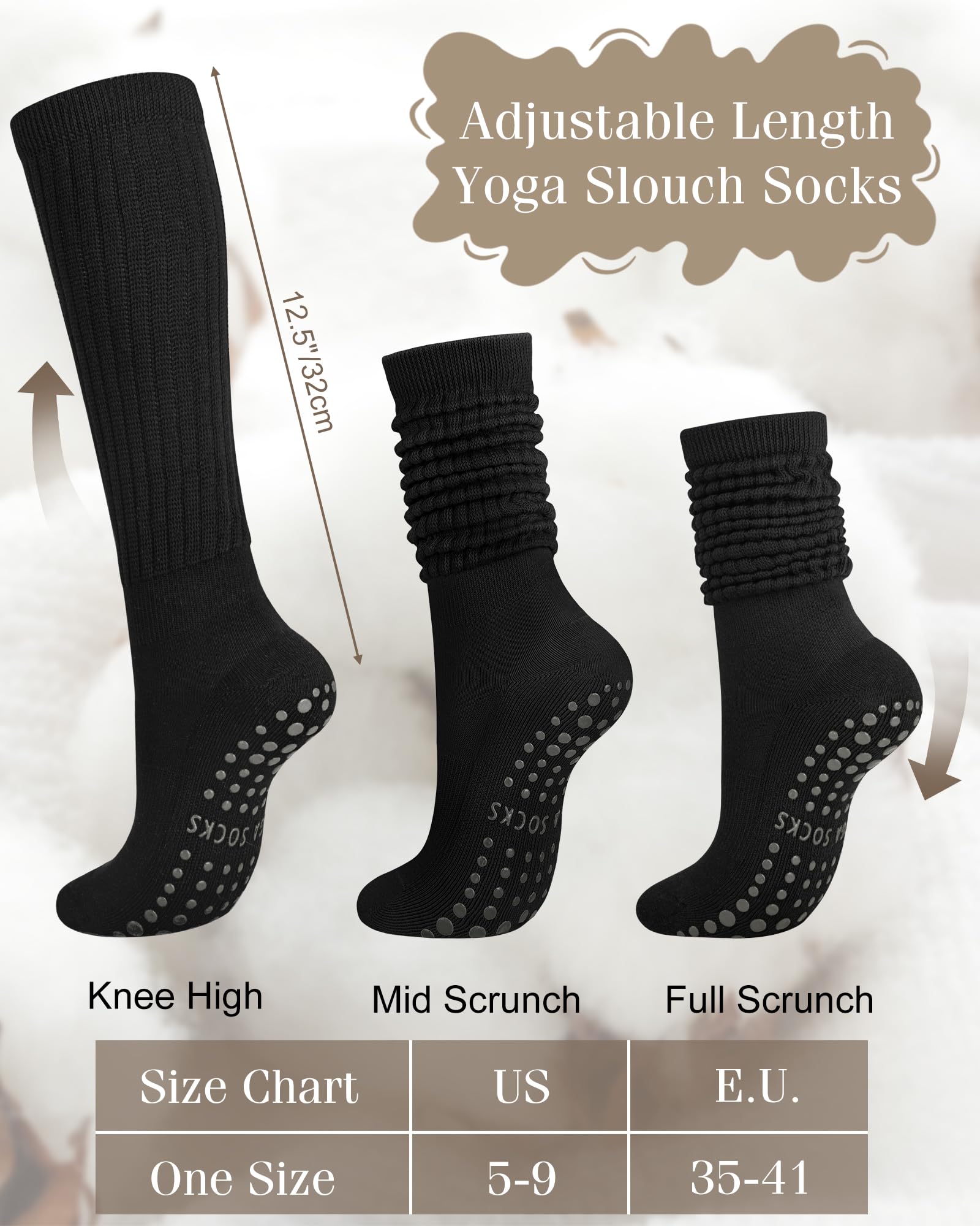 - Adjustable Grippy Socks: Yoga socks for women non slip can easily adjust the height, roll fall socks up to the ankle or pull it up to the knee as a knee length sock; These Pilates socks are great with shorts, skirts or boots to keep you warm and stylish