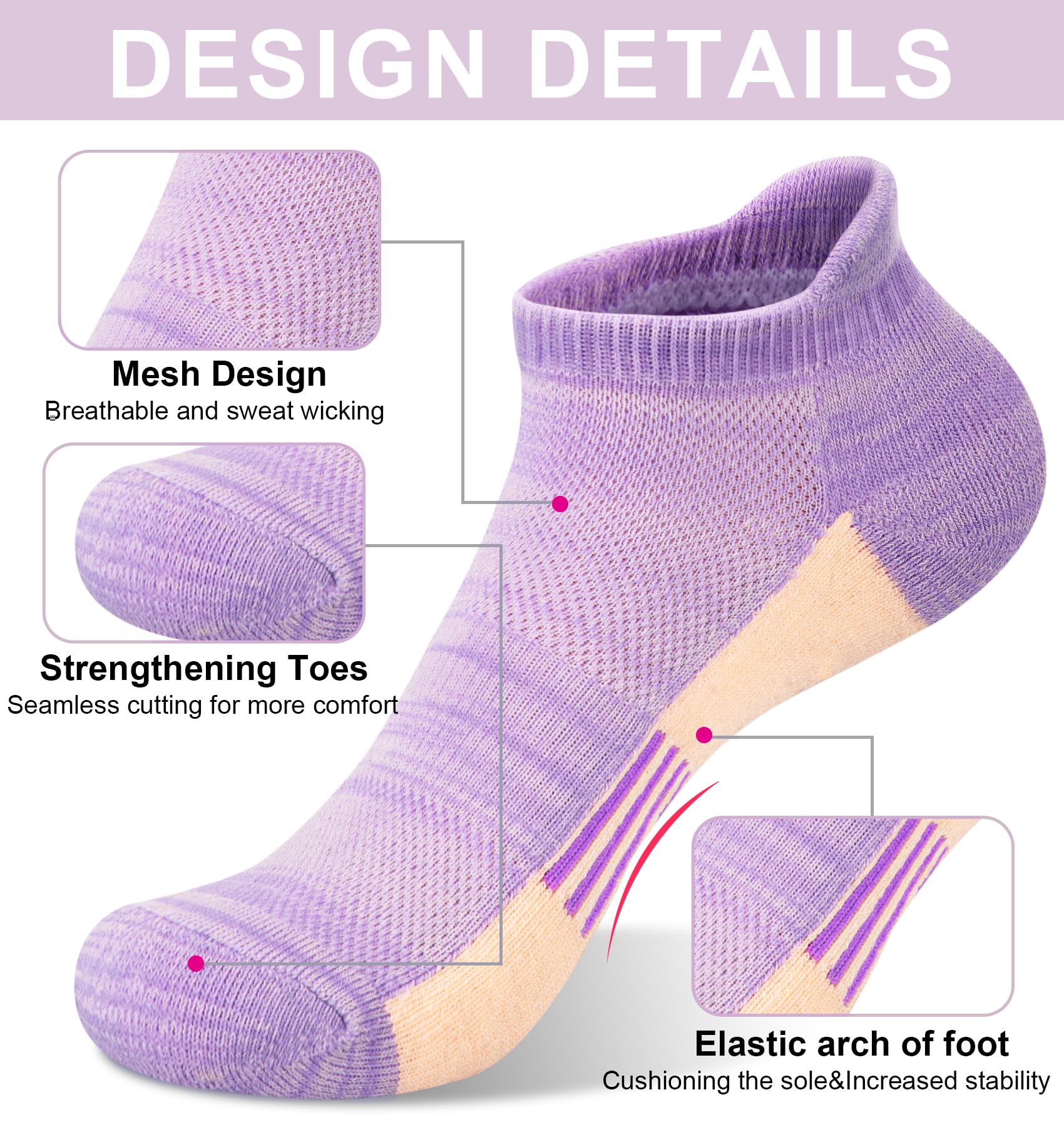 - Wicking Cotton Socks: Womens ankle socks are made of breathable cotton blend, absorbing sweat, keeping your feet cool and dry even during strenuous activity; This womens socks adopt a breathable mesh design that can eliminate heat