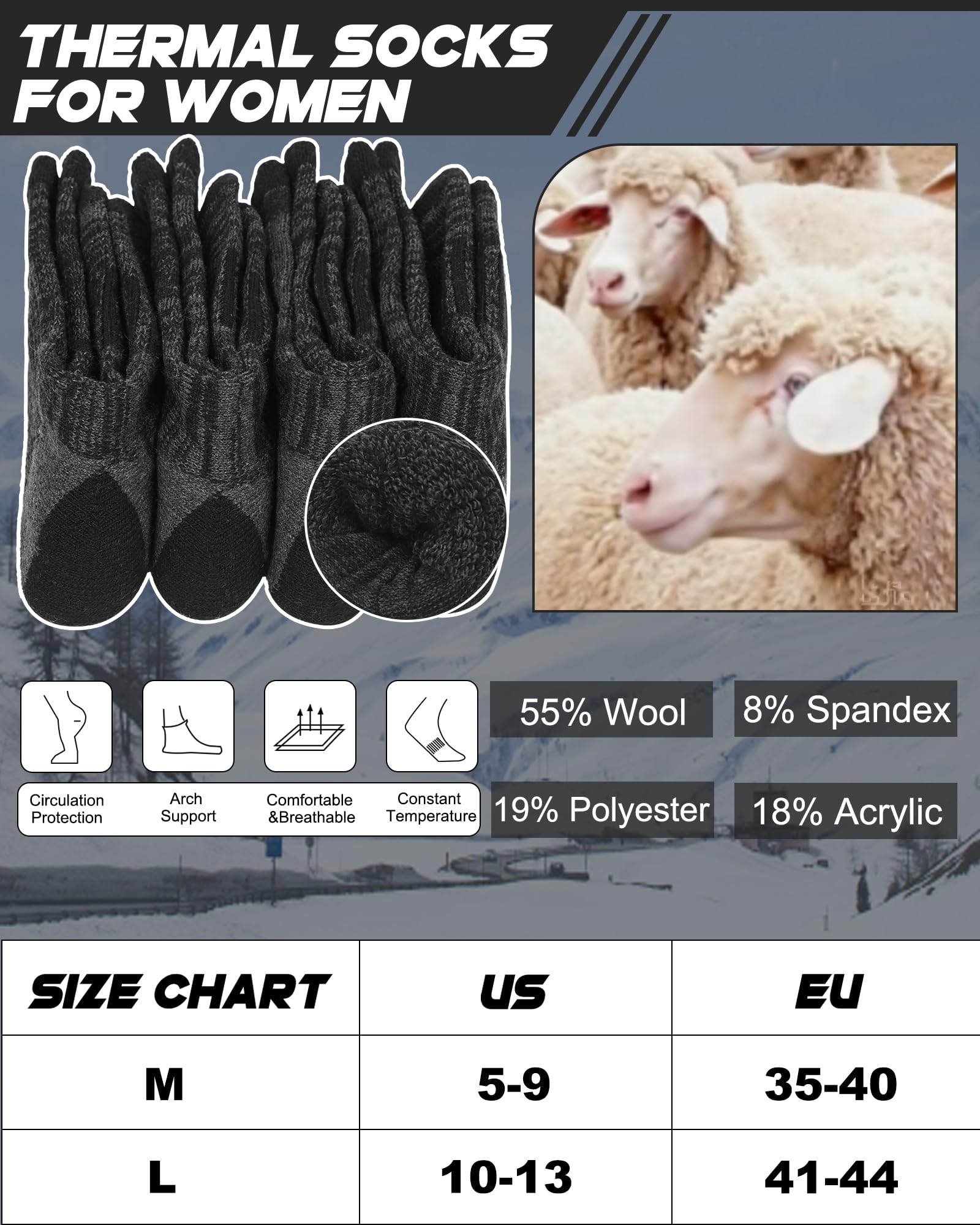 - Elastic Band: Merino wool socks with stretchy cuff and arch support can improve the blood circulation and keep socks fit snugly; Womens winter socks provide a comfortable surrounding feeling and reduce foot fatigue, suitable for athletic activities